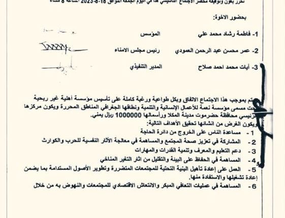وبالوثائق كشف رئيس تحرير صحيفة (إيلاف) المقربة من حزب الإصلاح محمد الخامري في منشور على صفحته في (فيس بوك)، إنشاء العليمي “مؤسسة نعمة للعمل الإنساني” بإسم ابنته “فاطمة” في مدينة المكلا مركز محافظة حضرموت، تمهيداً لمرحلة الإعمار القادمة والتي تقدر بمليارات الدولارات.