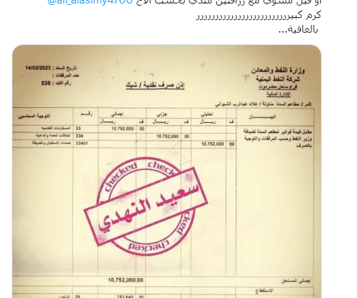 وآخر تلك الوثائق فاتورة غداء لوزير النفط في حكومة معين الشماسي من احد مطاعم المكلا وقد وصلت قيمتها إلى نحو 11 مليون ريال.