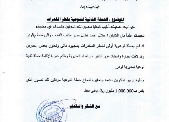 ثمة ما يعصر القلب حين تقوم مجموعة صغيرة من خيرة شباب لودر بعمل طوعي غير مدعوم من منظمات بحملة أولى نوعية ناجحة وبشهادة الجميع قبل سنتان بقيادة الناشط الحقوقي الكابتن جلال النسي ابو الشباب ودعم بسيط يشكر عليه من القادة ابو مشعل الكازمي مدير عام أمن أبين والخضر حمصان مدير أمن لودر السابق وقتها كان المحافظ مسافر، وعند السعي لإقامة حملة توعية ثانية بمخاطر المخدرات بمديرية لودر تم الاعداد لها مبكراً والتواصل مع كافة الجهات ذات العلاقة المباشرة والمعنية وقدمت مذكرات رسمية مع تصور متكامل من مدير عام المديرية ورئيس المجلس المحلي في لودر الأستاذ النشيط ناصر عوض موسى قبل شهر ومدير عام مكتب الشباب والرياضة بالمحافظة الكابتن أحمد الراعي إلى سيادة المحافظ الصادق برعاية ودعم الحملة مبلغ بسيط مليون ريال يمني بينما تصرف الملايين بحملات التوعية بمخاطر المخدرات في المحافظات الأخرى على أن يشرف عليها كالعادة معد ومنسق الحملة أبو الشباب مدير مكتب الشباب والرياضة في لودر.