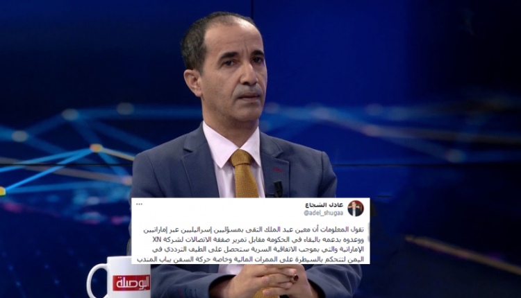 وكشفت تغريدة الشجاع أن معين التقى مسؤولين إسرائيليين عبر مسؤولين إماراتيين رتبوا لهذا اللقاء، وأن الإسرائيليين وعدوا معين بإبقائه رئيساً في حكومة التحالف مقابل تمريره صفقة تسليم قطاع الاتصالات في عدن لشركة (NX) (الإماراتية الإسرائيلية) لإدارة هذا القطاع السيادي والتحكم به.