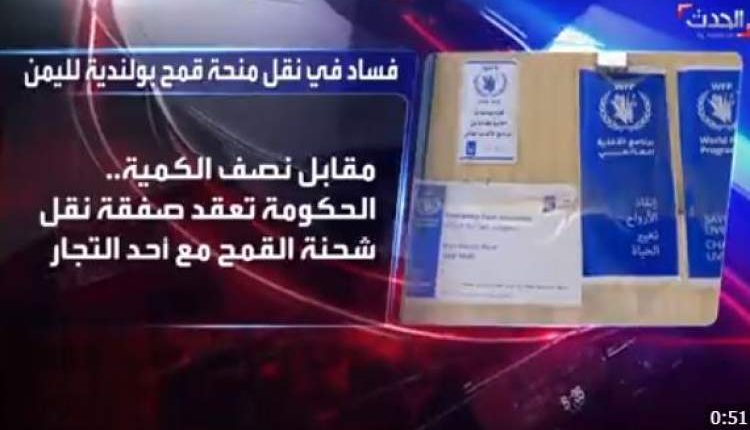 سلطت قناة الحدث السعودية الضوء على فضيحة الفساد التي تورطت فيها حكومة معين عبدالملك حول بيع نصف منحة القمح البولندية لأحد التجار مقابل نقل الشحنة من إلى اليمن.
