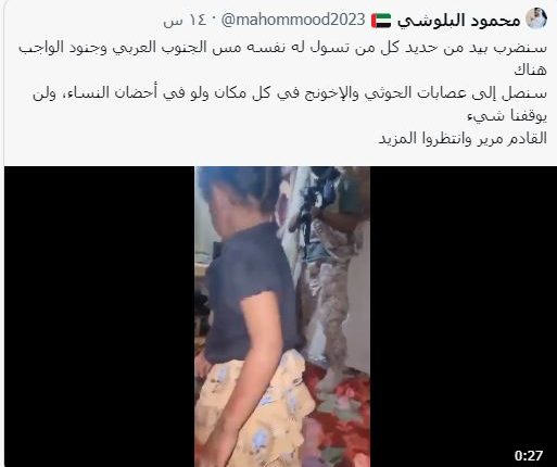 وقال محمود البلوشي، أحد ابرز ضباط الإستخبارات الإماراتية وناشطيها على مواقع التواصل الاجتماعي، إن بلاده ستضرب بيد من حديد ضد كل من تسؤل له نفسه مس جنود الواجب هناك، متوعدة بملاحقتهم ولو كانوا في أحضان النساء.