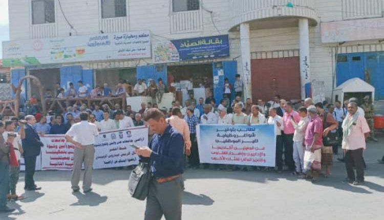 ونفذت نقابات هيئة التدريس وموظفي جامعات عدن ولحج وأبين وشبوة، وقفة احتجاجية أمام بوابة قصر معاشيق في مدينة عدن، للمطالبة بتحسين حقوق العاملين في المجال التعليمي والأكاديمي.