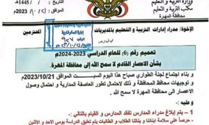 وفي سياق متصل، أعلن مكتب التربية والتعليم في محافظة المهرة عن إيقاف العملية التعليمية في مدارس المحافظة ليومي الأحد والاثنين تحسباً للأضرار التي قد يخلفها الإعصار المداري تيج القادم من بحر العرب.