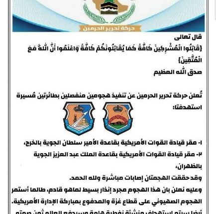 وقالت حركة (تحرير الحرمين) في بيان إنها “نفذت هجومين جويين منفصلين بطائرتين مسيرة استهدفتا مقر قيادة القوات الأمريكية بقاعدة الأمير سلطان الجوية في الخرج، ومقر قيادة القوات الأمريكية في قاعدة الملك عبدالعزيز الجوية بالظهران”.