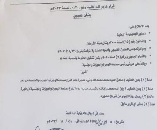 وأفادت مصادر بأن حيدان أصدر قراراً بتعيين صادق حمود الدباني مديراً عاماً لفرع مصلحة الهجرة والجوازات في محافظة تعز، بدلاً عن منصور العبدلي، الذي يشغل المنصب منذ 2017.