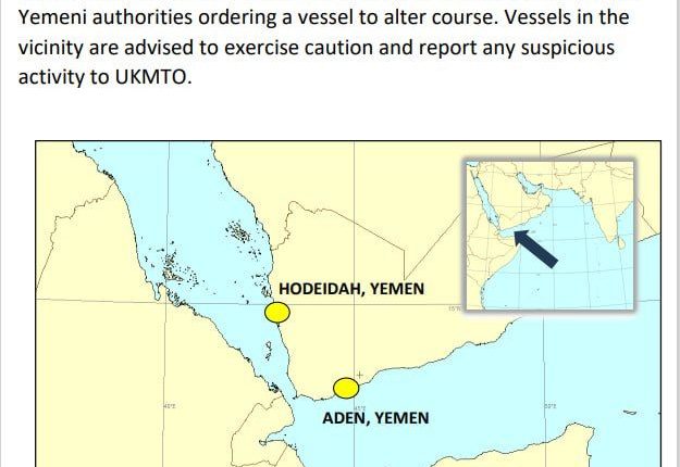 وأشار مركز العمليات التجارية البريطانية، في بيان، إلى إعتراض صنعاء لسفينة إسرائيلية قادمة من خليج عدن، متجهة إلى أحد الموانئ في فلسطين المحتلّة، مؤكداً تحويل السفينة مسارها بعد تلقيها بلاغ من قوات صنعاء.