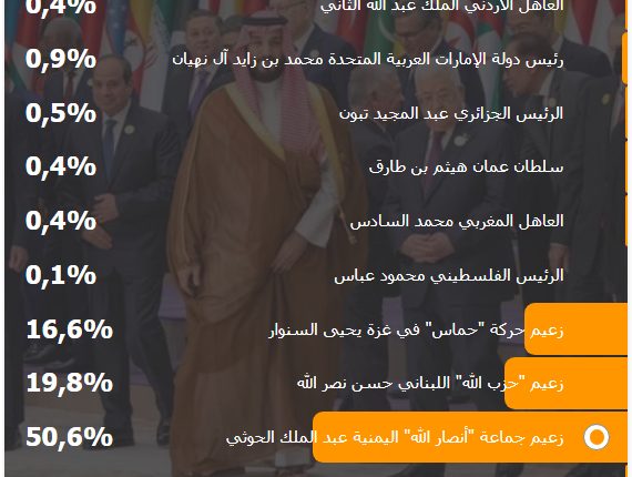والاستفتاء كان حول ترشيحك لزعيم عربي على خلفية حرب غزة. وأبرزت القائمة الروسية تفوق لقادة المقاومة في اليمن ولبنان وفلسطين حيث حاز زعيم حزب الله حسن نصر الله نحو 205 من الأصوات تلاه يحيى السينوار القيادي بحركة حماس بنحو 17% في حين تدنت مستويات زعماء آخرين حاولوا تسويق انفسهم وانفقوا المليارات خلال السنوات الأخيرة وابرزهم ولي العهد السعودي والذي لم يحصل سوى على 8%.