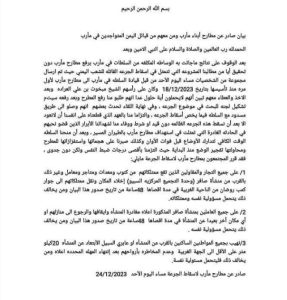 وقال بيان صادر عن مطارح أبناء مأرب ومن معهم من قبائل اليمن إنه تبين بعد الأخذ والرد مع الوساطة المكلفة من السلطة في مأرب ممثلة بمحافظها سلطان العرادة، لا يحملون أي حلول، وأنهم جاءوا من أجل رفع المطرح ووصلوا إلى طريق مسدود من أجل إسقاط الجرعة.