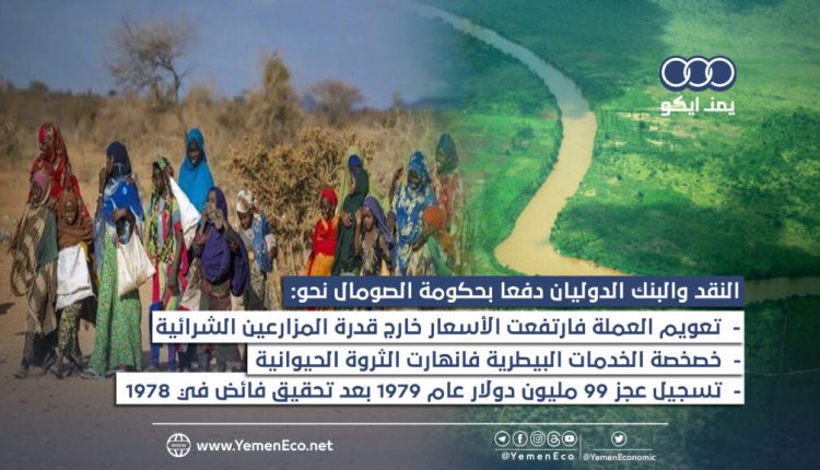 في فبراير ١٩٨٠ بدأت الصومال رحلتها مع صندوق النقد الدولي الذي نفذ معها ما يصفه الخبراء بالطب الاقتصادي؛ من خلال تشجيعها على إتباع روشتات برامج التكيُّف الهيكلي، والتي تركز في بداية تنفيذ خارطة عملها التدميرية على إستهداف العملة المحلية لصالح تسيُّد الدولار، فدخلت الصومال- تبعاً لذلك- غرفة إنعاش صندوق النقد الدولي، بهدف معالجة ما تعانيه حكومتها من عجز اقتصادي ومالي وإداري، رغم ما تملكه من أصول ومقومات اقتصادية رعوية.