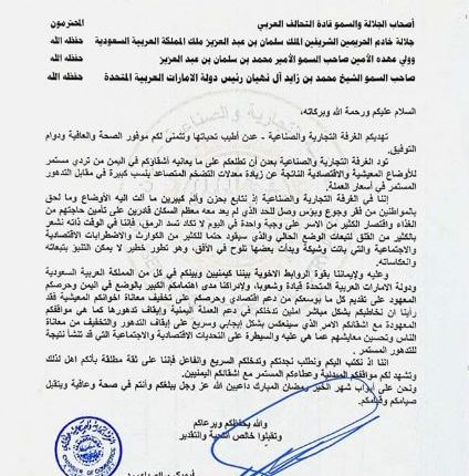 وقالت الغرفة التجارية والصناعية في رسالة وجهتها إلى سلمان ونجله إن اليمنيين يعانون من تدهور مستمر في الأوضاع الإقتصادية والمعيشية نتيجة إرتفاع معدلات التضخم بسبب التدهور المستمر في أسعار العملة.