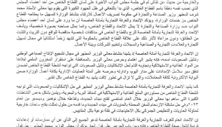 وفيما دعا الإتحاد العام للغرف التجارية والصناعية وغرفة الأمانة والجميع إلى النأي بالقطاع الخاص عن أي ممارسات أو ادعاءات فردية تنتحل صفة القطاع الخاص..