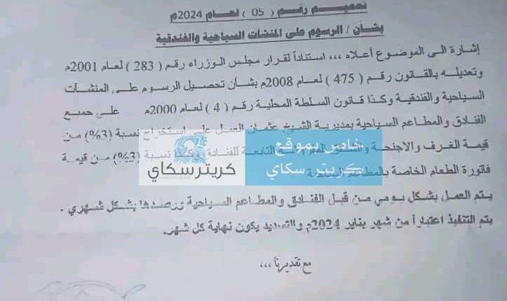 وبحسب الوثيقة، فإن سعيد وجه بفرض ضريبة 3% على جميع الفنادق والمطاعم السياحية بالشيخ عثمان، وذلك من قيمة الغرف والأجنحة والشقق المفروشة التابعة للفنادق.