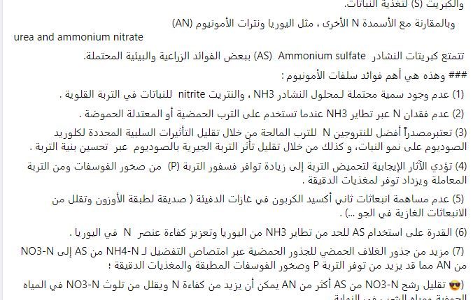 ويشير المقال إلى أن السماد من هذا النوع لديه خاصية في حال تعامله مع المياه المالحة أو شديدة الحمضية ومنها عدم فقدانه “ان اتش 3” أو ما يعرف بمحلول النشادر.