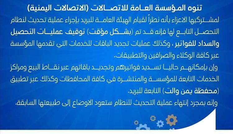 وقالت إن السبب في ذلك: “نظراً لقيام الهيئة العامة للبريد بإجراء عملية تحديث لنظام التحصل التابع لها”، وأشارت إلى أن “بإمكان المشتركين حالياً تسديد فواتيرهم وتجديد باقاتهم عبر نقاط البيع ومراكز الخدمات التابعة للمؤسسة والمنتشرة في كافة المحافظات وكذلك عبر تطبيق محفظة يمن والت) التابعة للبريد”.