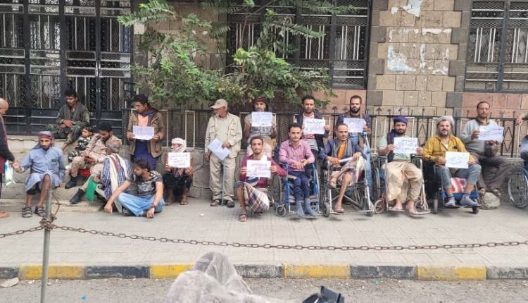 نظم جرحى محور تعز وقفة احتجاجية أمام شعبة الرعاية الاجتماعية، الإثنين، للمطالبة بالإفراج عن رواتبهم المتأخرة والإكرامية السعودية المحتجزة من قبل محور تعز.