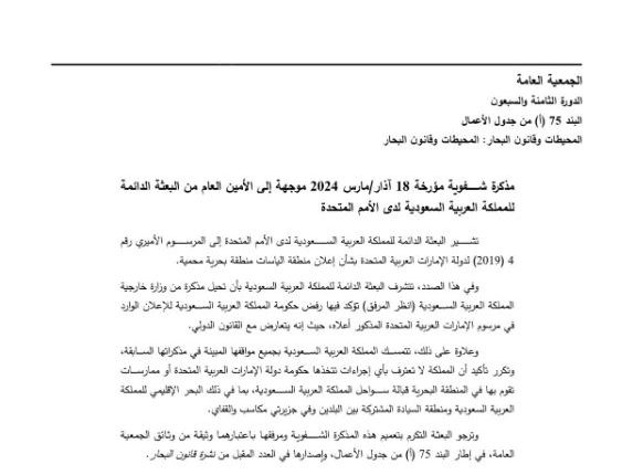 وقالت السعودية في مذكرة قدمتها بعثتها في الأمم المتحدة بتاريخ 18 مارس المنصرم، إنها ترفض مرسوم الإمارات المتضمن إعلان منطقة الياسات منطقة بحرية محمية.