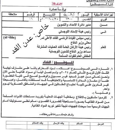 وأكدت هيئة الإمداد والتموين في الوزارة ببرقية عاجلة إلى رئيسا الحكومة والمجلس الرئاسي نفاد مخزونها من المواد الغذائية، مؤكدة بأنها غير قادرة على ارسال الوجبات الغذائية حتى إلى جبهات القتال.
