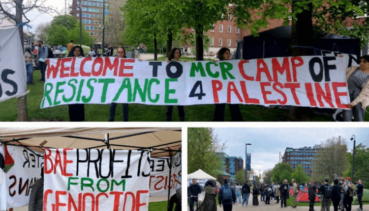 – ملأ طلاب من جامعة مانشستر حديقة الجامعة باللافتات واللوحات والأعلام الفلسطينية لدعوة الجامعة إلى “إنهاء شراكتها مع الأنظمة التي تدعم إسرائيل”. وكُتب على إحدى اللافتات: “بريطانيا تدعم الإبادة الجماعية الإسرائيلية”.