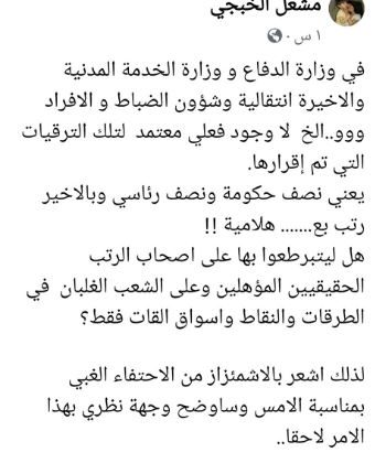 وقال مشعل الخبجي، شقيق عضو هيئة رئاسة المجلس الانتقالي الجنوبي رئيس وحدة شؤون المفاوضات في المجلس ناصر الخبجي، في منشور على (فيس بوك) إنه “لا في وزارة الدفاع ووزارة الخدمة المدنية والاخيرة انتقالية، وشؤون الضباط والافراد ووو.. إلخ ، لا وجود فعلي معتمد لتلك الترقيات التي تم إقرارها”.