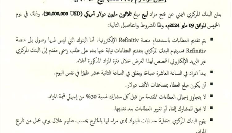 وأعلن البنك في بيان له الاثنين نيته بيع نحو 30 مليون دولار في مزاد كان قد توقف خلال الفترة التي أعقبت تعيين أحمد عوض بن مبارك رئيساً للحكومة في عدن.