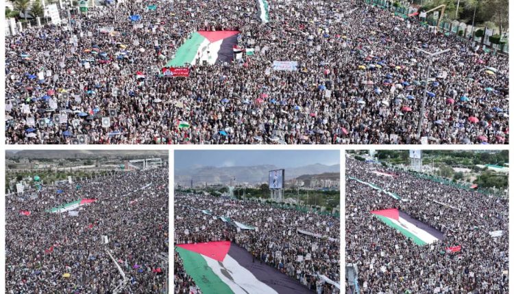 تجددت الحشد الهائل في ميدان السبعين أكبر ميادين العاصمة صنعاء، الجمعة، في مسيرة وصفت بالمليونية نصرة للشعب الفلسطيني تحت شعار “مع غزة جهاد مقدس ولا خطوط حمراء”.