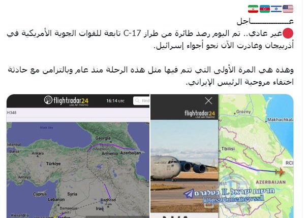والطائرة من نوع سي -17 وهي متخصصة للنقل الثقيل. وتظهر البيانات بأن الطائرة الأمريكية غادرت بعد لحظات قليلة على إعلان اختفاء طائرة الرئيس الإيراني إبراهيم رئيسي والتي كانت أقلعت من منطقة حدودية بين أذربيجان وايران عقب افتتاح رسميا لسد مشترك بين البلدين.