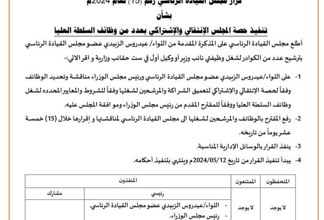 وقالت المصادر إن الزبيدي رشح 6 أسماء لرئيس مجلس القيادة رشاد العليمي لتعيينهم وكلاء وزارات بينهم:
