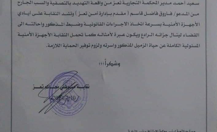 أفادت مصادر قضائية بتعز أن شقيق قائد محور تعز توعد مدير المحكمة التجارية بالتصفية الجسدية.