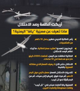 ونشر الاعلام الحربي للقوات المسلحة اليمنية مقطع فيديو للطائرة التي سميت بـ”يافا” تيمناً بالعاصمة المحتلة “تل ابيب”.