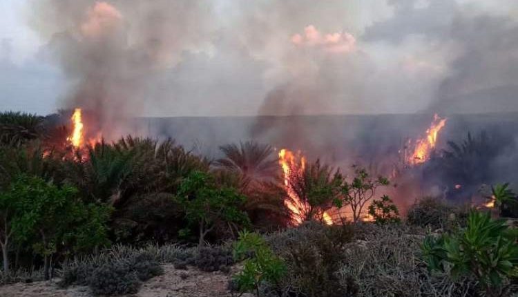 وأفادت مصادر بأن حريقاً اندلع مساء الأربعاء، في مزارع نخيل بمنطقة معابض شرقي أرخبيل سقطرى، سرعان ما امتد إلى مساحات واسعة.