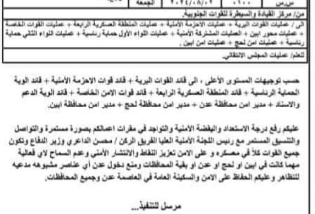 وقالت مصادر محلية ان قوات الانتقالي انتشرت في ساحة العروض ومداخلها وكذا الشوارع الرئيسة في مناطق عدن والمداخل الرئيسة للمدينة، كما كثفت تواجدها في نقطة العلم على طريق أبين عدن.