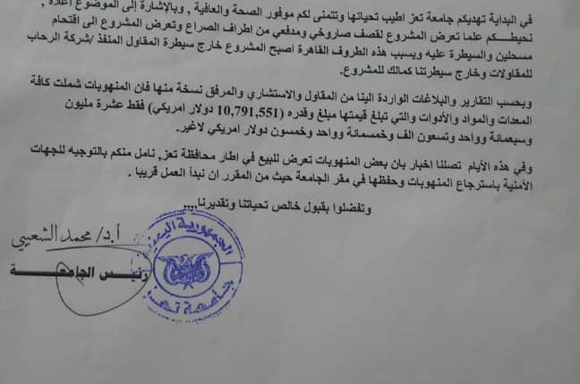 وأضاف: “شركة الرحاب التي فشلت في إنجاز مشروع كلية الطب بجامعة تعز في وقته المحدد قبل الحرب، بدلاً من دفعها غرامة تصل إلى 4 ملايين دولار ستحصل على 16 مليون دولار كتعويضات”.
