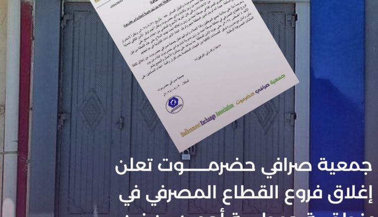 حفاظاً على سلامة الموظفين والعملاء وأموالهم أعلنت جمعية صرافي حضرموت الإغلاق الشامل لجميع فروع القطاع المصرفي في منطقة حوطة أحمد بن زين بمديرية شبام بوادي حضرموت.