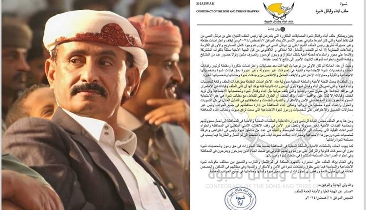 بيان الحلف الشبواني تحدث ان سلسلة من المضايقات المفتعلة التي تستهدف قيادات وشخصيات شبوة الاجتماعية والقبلية، واصفاً تلك التصرفات بغير المسؤولة و تهدف إلى الانتقاص من مكانة وجاهات المحافظة.