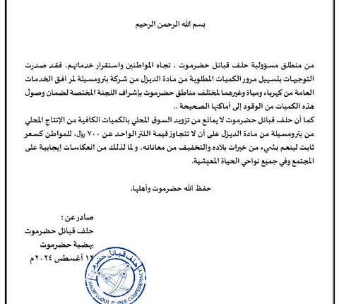 وأكد بيان صادر عن الحلف أنه يتجه لتزويد السوق المحلي بالكميات الكافية من الإنتاج المحلي بترومسيلة من مادة الديزل على الا يتجاوز قيمة اللتر الواحد عن 700 ريال للمواطن كسعر ثابت لينعم بشيء من خيرات بلاده.