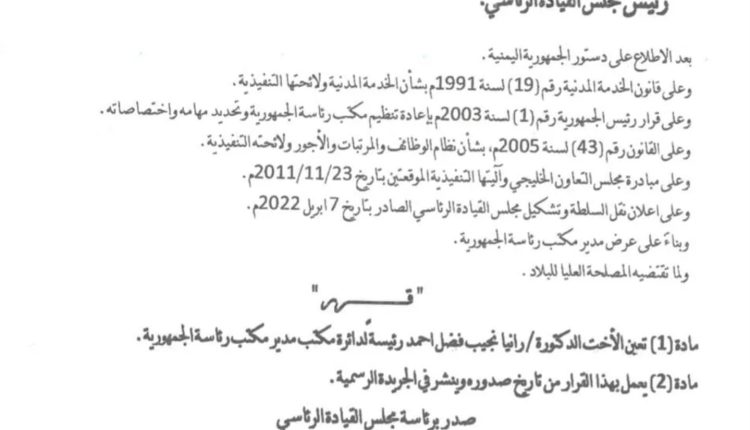 ونشرت قيادات من الانتقالي، قرارات تعيين اصدرها العليمي في مناصب قيادية برئاسة الجمهورية بينها قرار تعيين الناشطة رانيا نجيب فضل تحمل بكالوريوس في ادارة المشاريع، رئيسةً لدائرة مكتب مدير مكتب الرئاسة.