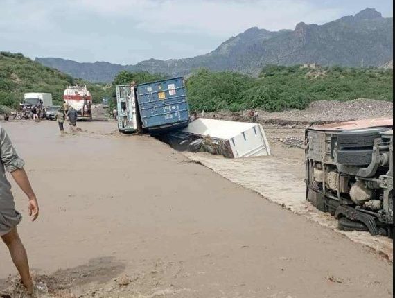 في الاثناء جرفت سيول الأمطار حافلة ركاب وشاحنتين على طريق صنعاء الحديدة.