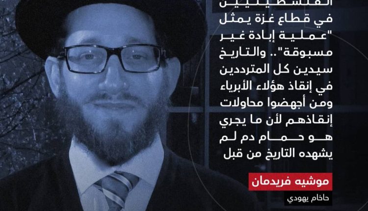 الحاخام اليهودي موشيه فريدمان، وهو من يهود الحريديم المحافظين، قال في مقابلة سابقة مع الجزيرة نت، إن ما تقوم به إسرائيل والولايات المتحدة بحق الفلسطينيين في قطاع غزة يمثل عملية إبادة غير مسبوقة..