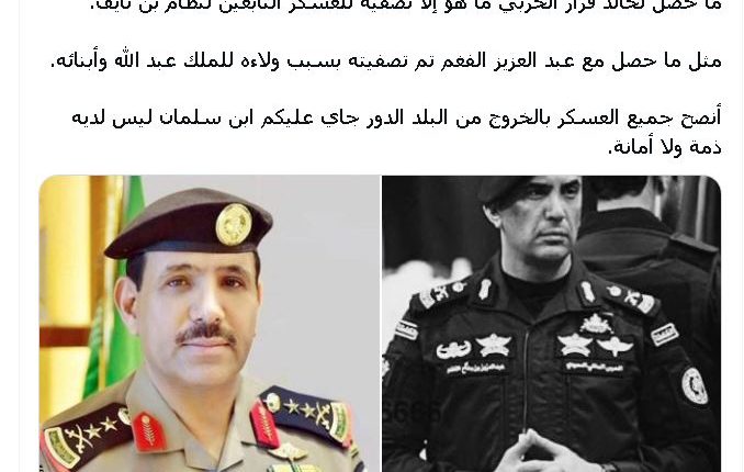 ناصحاً جميع العسكر بـ “الخروج من البلد”، محذراً إياهم بأن “الدور جاي عليكم.. ابن سلمان ليس لديه ذمة ولا أمانة”.