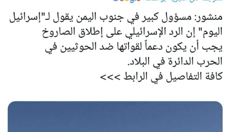 مسؤول في حكومة بن مبارك يطلب دعماً من كيان الاحتلال لمواجهة صنعاء رداً على قصفها “تل أبيب“ بصاروخ فرط صوتي…!