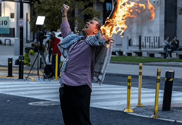 اقدم صحفي أمريكي، على إحراق نفسه خلال تظاهرة احتجاجية أمام البيت الأبيض في الذكرى السنوية لـ”طوفان الأقصى” قبل ان يتم إطفاء النار ومنع تسربها الى جسده، حيث جاءت خطوته احتجاجاً على الدعم الأمريكي للابادة الجماعية في غزة.