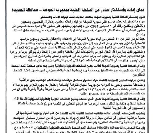 مشيرة إلى أن السلطة المحلية في الخوخة حملت بعثة الأمم المتحدة لتنفيذ اتفاق الحديدة (اونمها) مسؤولية سلامة المعتقلين داعية إياها إلى الضغط على الموالين للإمارات من أجل الافراج عنهم.