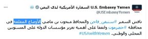 وقالت السفارة الأمريكية في تدوينة على (اكس)، أن “السفير ستيفن فاجن ناقش مع المحافظ مبخوت بن ماضي الأوضاع المقلقة في محافظة حضرموت”.