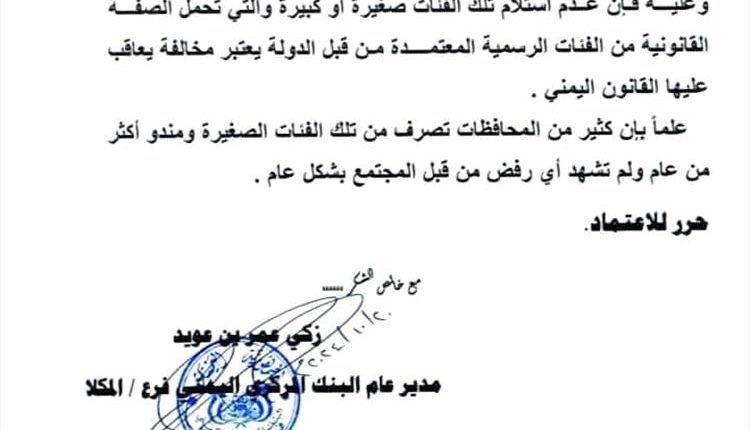 واعلن فرع البنك المركزي اليمني في حضرموت، شرقي البلاد، قراره الاستعانة بالاورواق النقدية التي سبق لمركزي عدن وان سحبها من السوق.