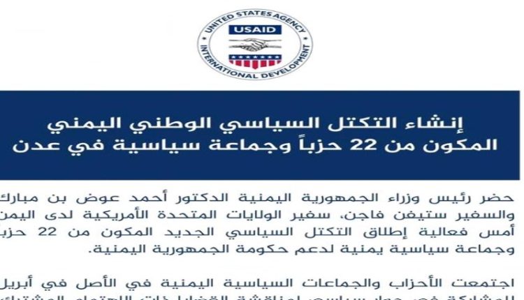 سارعت السفارة الأمريكية لمباركة وتأييد اعلان التكتل الحزبي الجديد الذي أعلن عن اشهاره أمس في عدن.