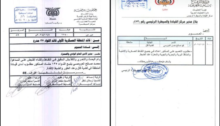 مشيرة إلى تمكن العروسي من الخروج من بوابة قيادة المنطقة بسلاحه الشخصي، قبل أن يتم التعميم باسمه على جميع النقاط العسكرية في سيئون وحضرموت للقبض عليه.