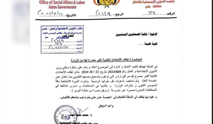أصدر مكتب وزارة الشئون الاجتماعية في مدينة عدن قراراً بإيقاف نشاط نقابة الصحفيين اليمنيين.