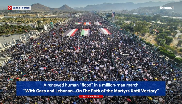 خرج اليمنيون في مسيرات “مليونية” متجددة، في العاصمة صنعاء وعدة محافظات تحت شعار “مع غزة ولبنان.. على درب الشهداء حتى النصر”.