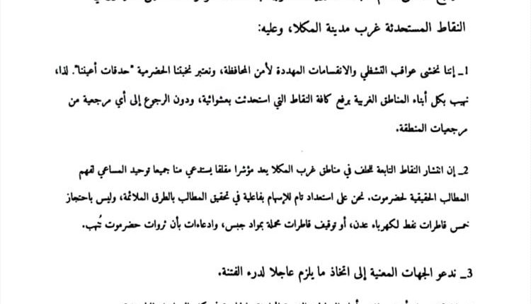 واصدر ما يعرف بالمجلس العام لأبناء المديريات الغربية لمدينة المكلا، المركز الإداري لحضرموت، بيان يطالب فيه قبائل الوادي والصحراء بسرعة الانسحاب من المديريات الغربية.